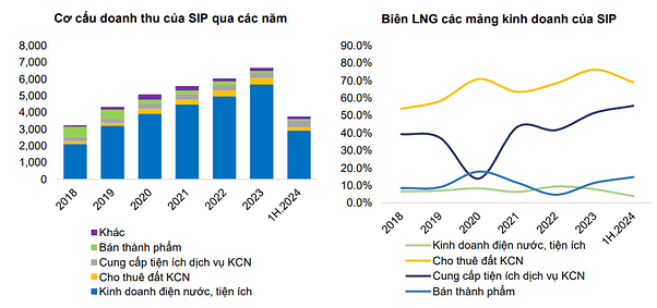 - Trong cơ cấu doanh thu thuần của SIP, doanh thu cung cấp tiện ích điện nước luôn chiếm trên 85% tổng doanh thu công ty mẹ, 75% tổng doanh thu hợp nhất qua các năm và luôn duy trì ổn định với tỷ trọng đóng góp doanh thu lớn nhất qua các năm. SIP có giấy phép phân phối điện tại các KCN, SIP mua điện của EVN, hạ áp và bán lại với BLNG khoảng 7%.