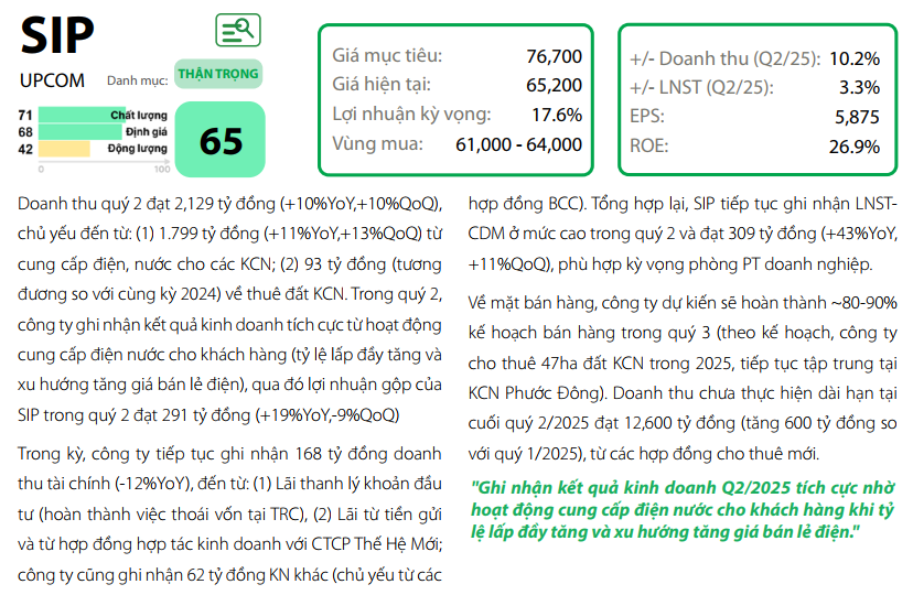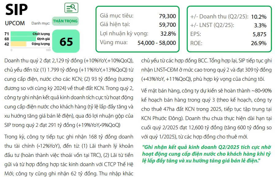 Về lợi nhuận từ hoạt động kinh doanh, tổng doanh thu dự kiến đạt 8.334 tỷ đồng, tăng 10% so với năm trước. Điều này đến từ hai nguồn chính: trước hết, doanh thu 7.080 tỷ đồng từ dịch vụ điện và nước tại các KCN, nhờ tỷ lệ lấp đầy tăng lên và giá bán lẻ điện dự kiến tăng 3% trong năm 2025; thứ hai, doanh thu 482 tỷ đồng từ các hợp đồng đã ký tại KCN Phước Đông và KCN Lộc An Bình Sơn. Lợi nhuận gộp trong năm dự kiến đạt 1.219 tỷ đồng, tăng 16% so với năm trước.