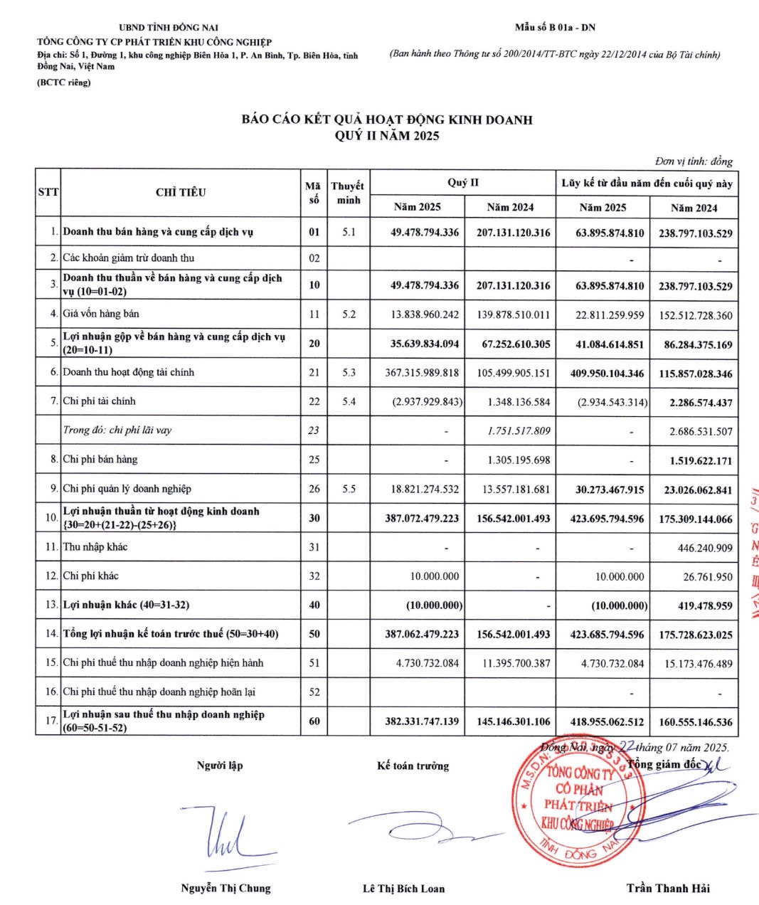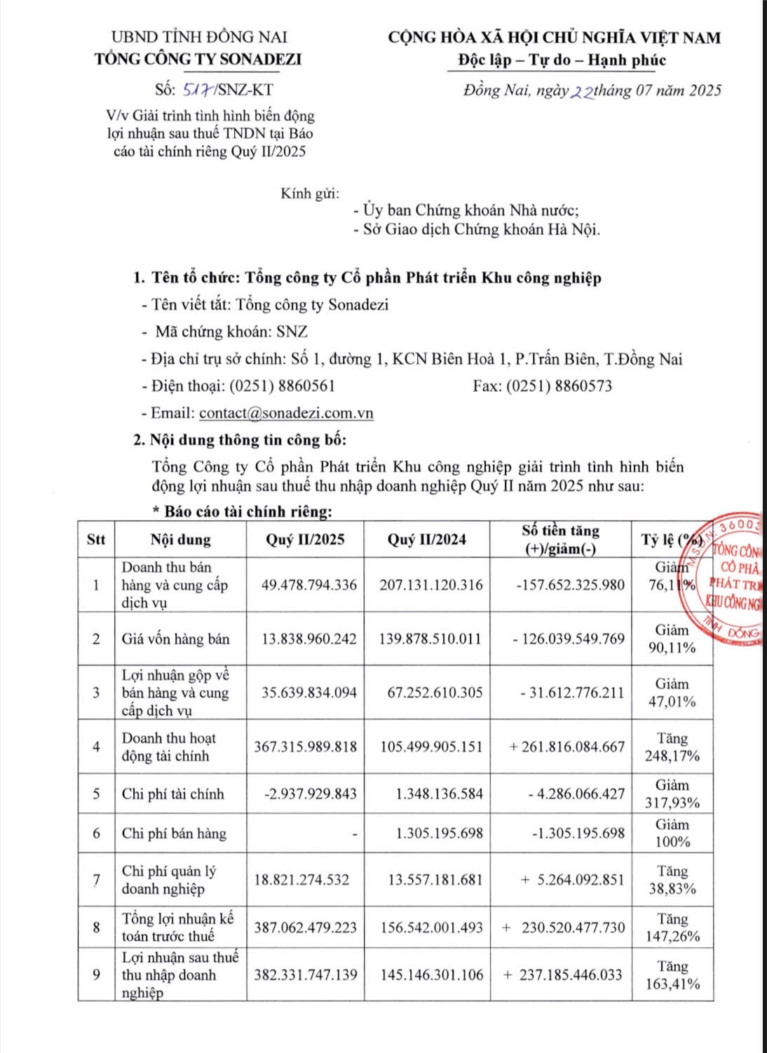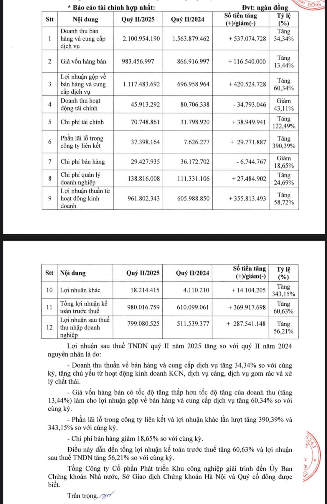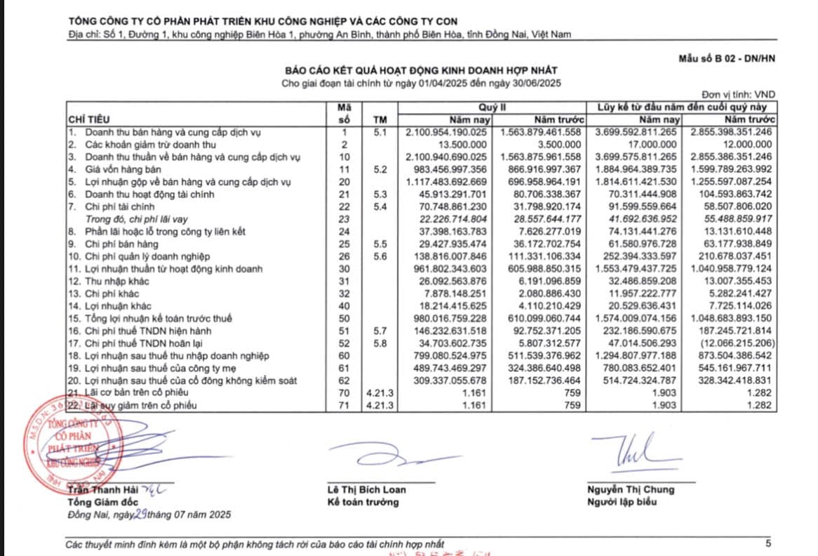 Sau khi trừ chi phí và thuế, Sonadezi báo lãi sau thuế hơn 799 tỷ đồng, tăng 56% so với quý II/2024, tương đương trung bình mỗi ngày lãi hơn 8,8 tỷ đồng.