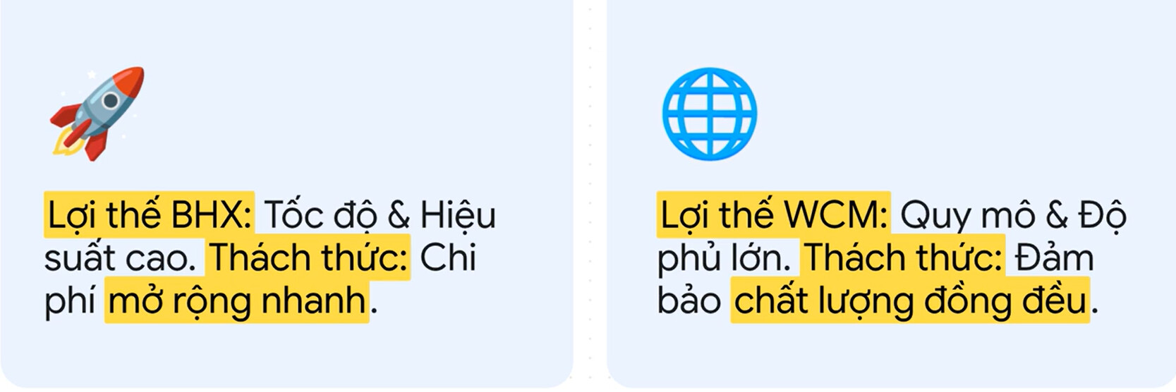 Trong cuộc đua giành thị phần, tốc độ mở rộng không phải là yếu tố quyết định duy nhất. Cách thức mở rộng, lựa chọn thị trường mục tiêu và mô hình kinh doanh được định vị ra sao mới là những nhân tố quyết định sự thành công bền vững trong dài hạn. Cả BHX và WCM đều đang triển khai những chiến lược riêng biệt, phản ánh thế mạnh và tầm nhìn của công ty mẹ.