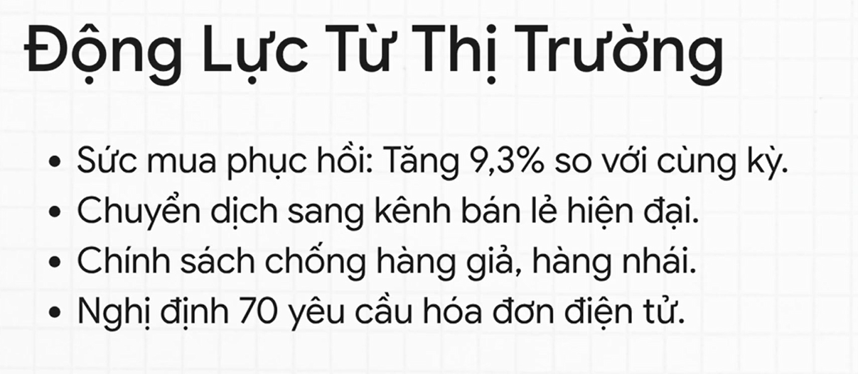 Phục hồi kinh tế và sức mua: Nền kinh tế đang trên đà phục hồi với tổng mức bán lẻ hàng hóa và dịch vụ 7 tháng đầu năm 2025 tăng 9,3%. Thu nhập bình quân đầu người tiệm cận mốc 5.000 USD là tiền đề vững chắc cho sự tăng trưởng của ngành.