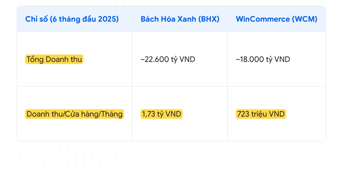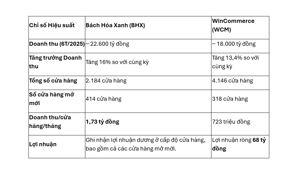 Dưới đây là bảng so sánh trực tiếp các chỉ số hiệu suất chính của Bách Hóa Xanh và WinCommerce: