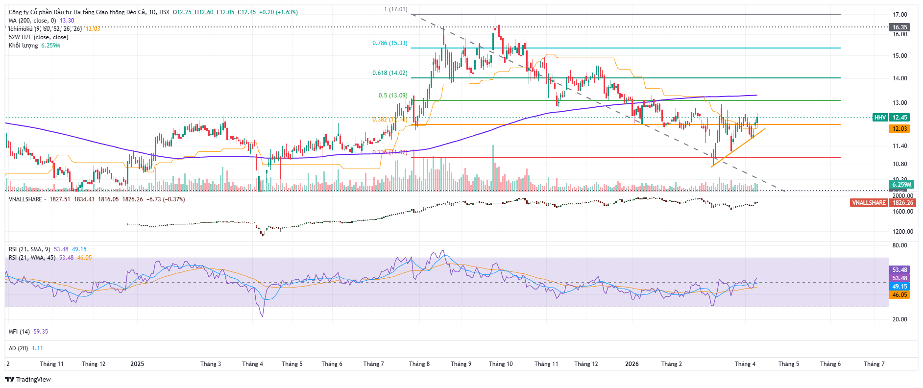 Backlog xây dựng đạt 2.400 tỷ, tỷ lệ backlog/doanh thu là 1,8x — đảm bảo nguồn việc tốt. Năm 2026, HHV được giao quản lý vận hành thêm 136km cao tốc mới (Quảng Ngãi – Hoài Nhơn và Chí Thạnh – Vân Phong) — mảng BOT sẽ tiếp tục tăng trưởng đều đặn.