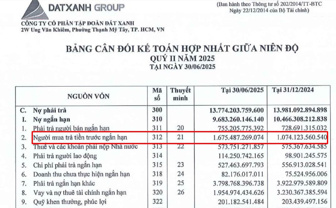 DXG: Giá trị người mua trả tiền trước tăng hơn 600 tỷ tính đến hết 6 tháng đầu năm 2025 cho thấy dự án của Đất Xanh thật sự gây được sự chú ý và hấp dẫn trong mắt nhà đầu tư. Điều này giúp doanh nghiệp sẽ có được dòng tiền dòng ổn định.