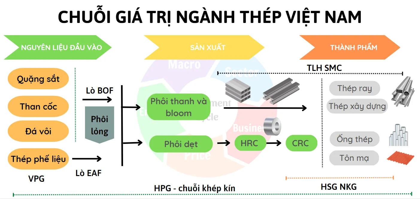 Về chuỗi giá trị ngành thép: Có thể dễ dàng thấy HPG đang gần full chuỗi giá trị kiểm soát được đầu vào đầu ra. Trong HSG và NKG đang nằm ở khâu giữa: Nhập HRC về dập tôn đem bán. Dễ thấy mô hình kinh doanh của HPG sẽ có tính ổn định hơn hai ông còn lại