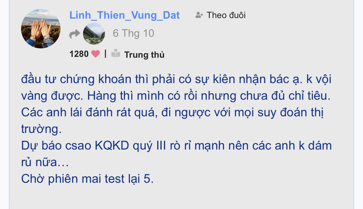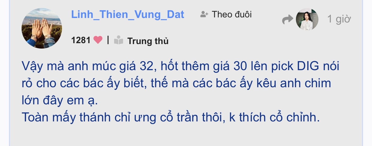 Tớ hô từ 29/9 còn chưa được 2x :))) lên sau mà lãi gớm vậy? Lãi mõm à :)))