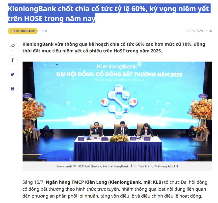 Kienlongbank (KLB) tổ chức đại hội bất thường 2025, đề xuất chia cổ tức 60% bằng cổ phiếu