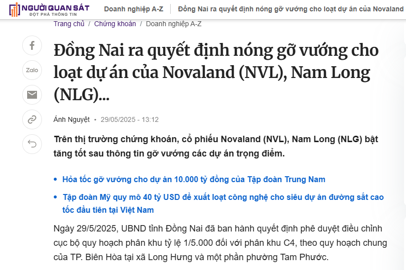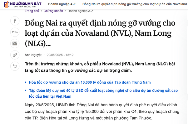 Ngày 29/5/2025, thông tin từ UBND tỉnh Đồng Nai xác nhận việc tháo gỡ pháp lý cho hàng loạt dự án của NVL và NLG, khiến cả thị trường BĐS như được “bơm oxy”. Không chỉ giúp NVL – NLG bật tăng, mà còn tạo hiệu ứng lan tỏa đến toàn bộ nhóm cổ phiếu BĐS.
