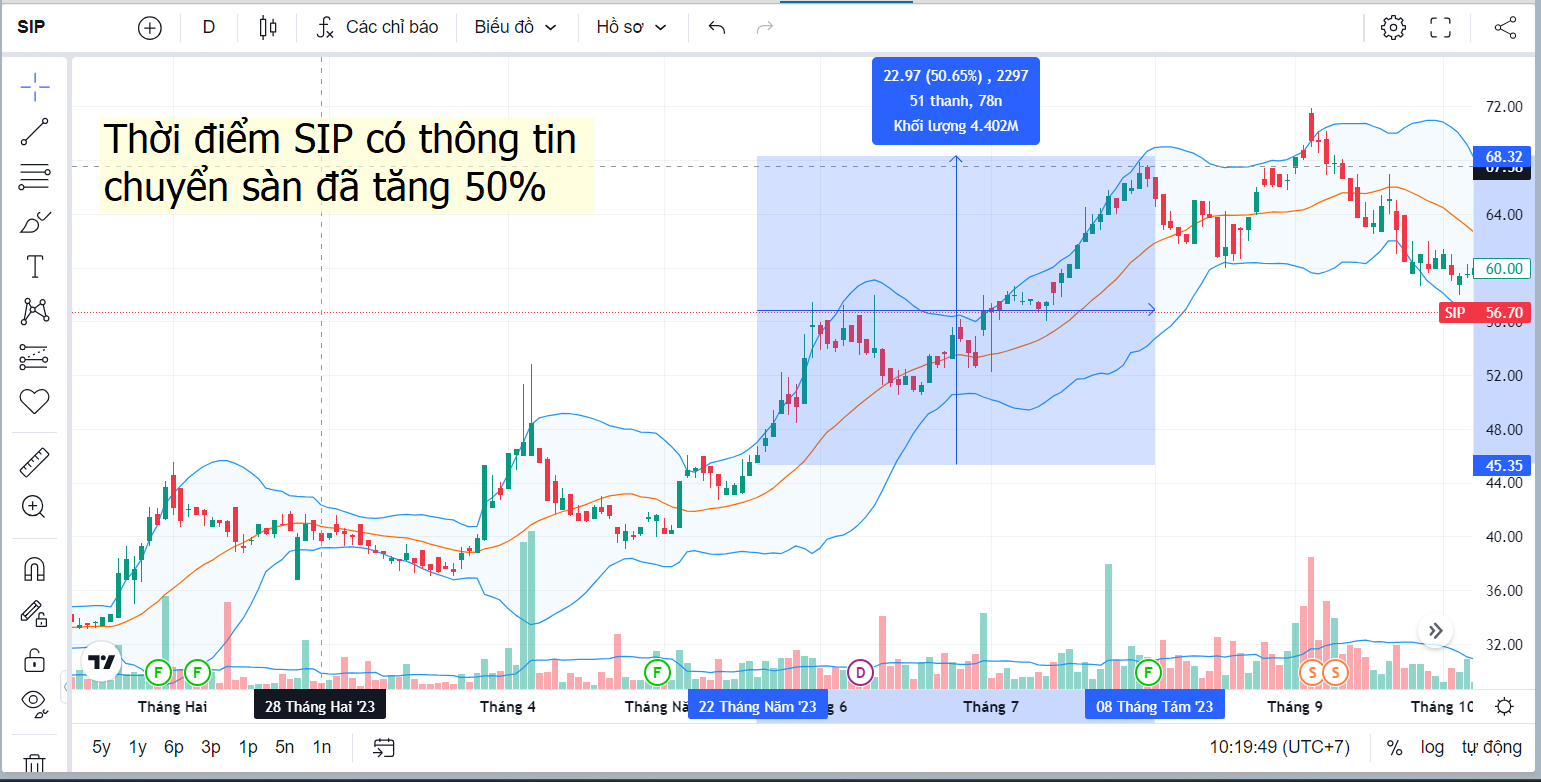 Gần đây nhất, chúng ta có cổ phiếu SIP cũng chuyển sàn từ tháng 6/23, và từ khi có những thông tin về việc chấp thuận chuyển sàn thì cổ phiếu SIP cũng tăng 50% tính đến ngày chuyển sang sàn HOSE (tháng 8/2023).