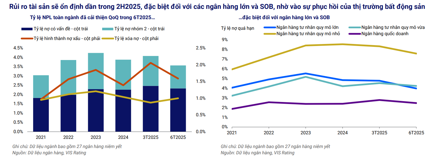 - Cải thiện mạnh mẽ: Nợ xấu giảm, chi phí tín dụng hạ, khả năng thu hồi nợ tốt hơn (VIS Rating). Các mã như CTG, MBB, VPB được hỗ trợ thêm bởi tiến triển pháp lý dự án BĐS 1.