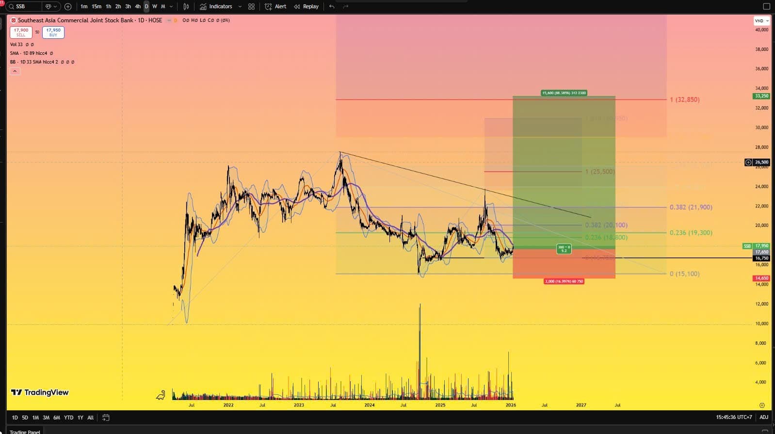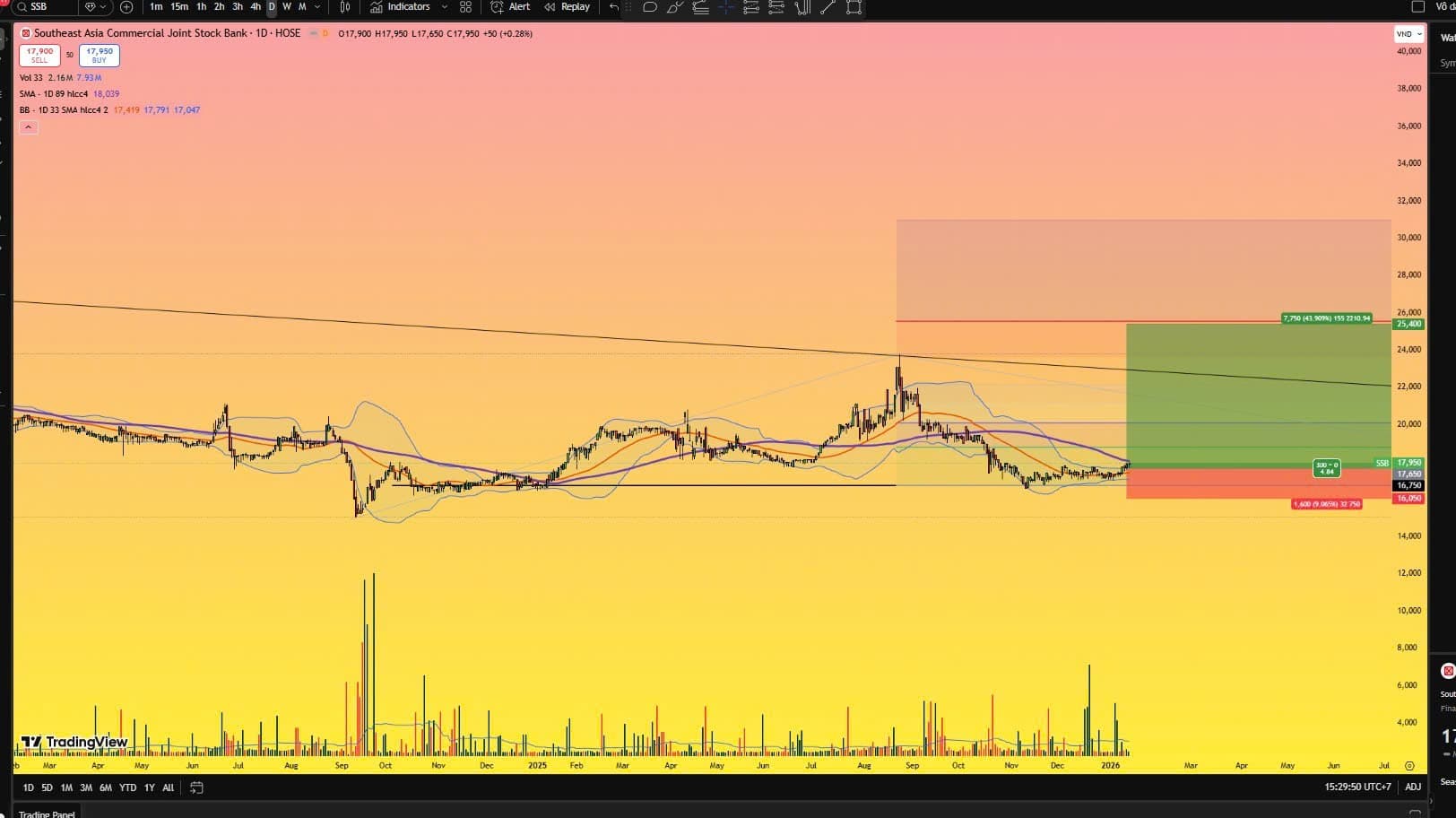 • Định giá năm 2026-2028 của tôi về SSB ở mức P/E 10-12 trong điều kiện BRG nằm im thì SSB có thể có mức giá 28-32 theo sự sôi động trở lại của BRG. Nếu BRG phát triển các quỹ đất thì SSB sẽ tăng trưởng mạnh năm 2026-2027 và giá ngân hàng này có thể quanh mức 100.000 tỷ tương đương với gấp 2 lần hiện tại.