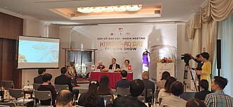 Nguyễn Thị Nga (ngoài cùng bên phải) tại Họp báo giới thiệu chương trình Kimono Aodai Fashion Show, tháng 2 năm 2023