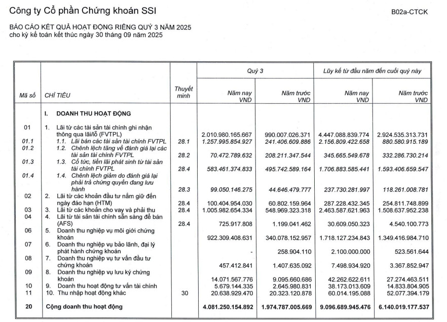 Doanh thu hoạt động của SSI trong Quý 3/2025