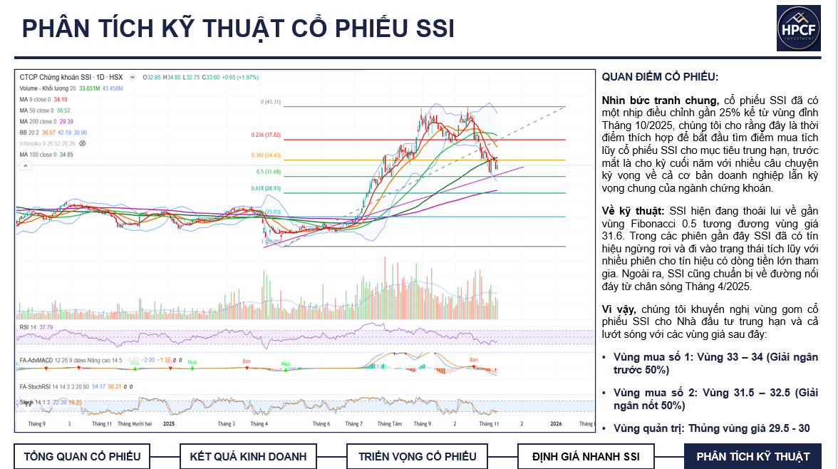 Nhìn bức tranh chung, cổ phiếu SSI đã có một nhịp điều chỉnh gần 25% kể từ vùng đỉnh Tháng 10/2025, chúng tôi cho rằng đây là thời điểm thích hợp để bắt đầu tìm điểm mua tích lũy cổ phiếu SSI cho mục tiêu trung hạn, trước mắt là cho kỳ cuối năm với nhiều câu chuyện kỳ vọng về cả cơ bản doanh nghiệp lẫn kỳ vọng chung của ngành chứng khoán.