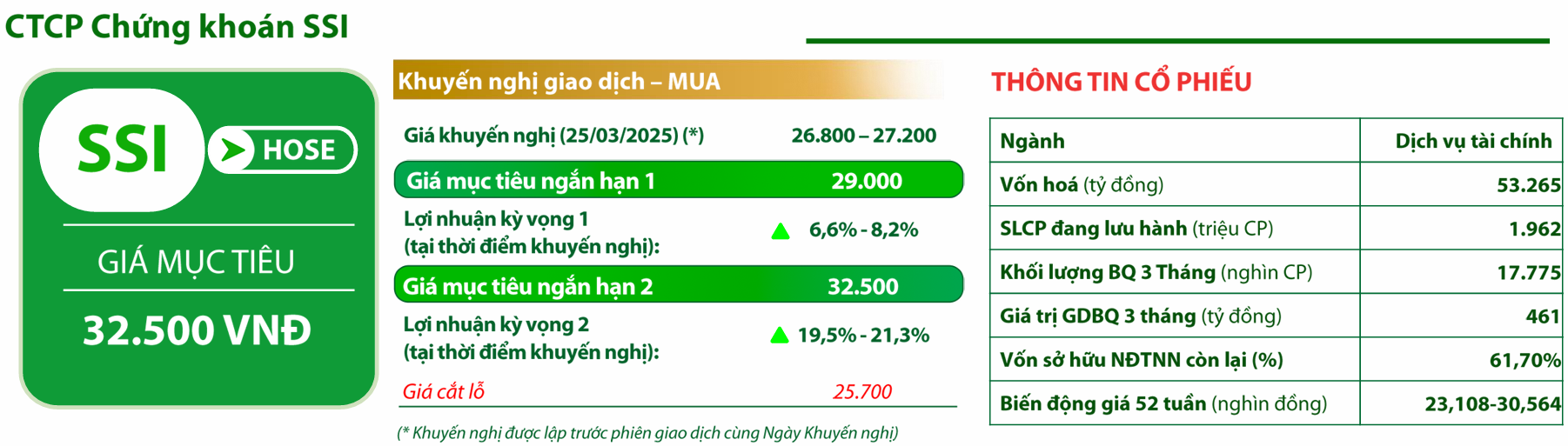 Bước sang năm 2025, SSI đặt mục tiêu doanh thu 9.695 tỷ đồng và lợi nhuận trước thuế 4.252 tỷ đồng, tăng trưởng lần lượt 15% và 20% so với năm 2025. Với hệ thống vốn mạnh, danh mục đầu tư ổn định, khả năng sinh lời cao và sự mở rộng vai trò trong mảng tư vấn doanh nghiệp – nổi bật là thương vụ chào bán 300 triệu cổ phiếu của Becamex IDC (dự kiến đấu giá vào ngày 28/04/2025) – SSI duy trì vị thế dẫn đầu và được kỳ vọng là một trong những bên hưởng lợi chính nếu thị trường duy trì thanh khoản tích cực.