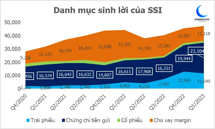 Nhìn sâu hơn về cơ cấu tài sản sinh lãi : các tài sản nhận lãi cố định (trái phiếu, chứng chỉ tiền gửi) chiếm tỷ trọng rất lớn trong cơ cấu danh mục. Cụ thể trái phiếu 11,629 tỷ; chứng chỉ tiền gửi 23,104 tỷ đồng trong khi cổ phiếu chỉ 1,448 tỷ đồng. Trái phiếu của SSI nắm giữ là các trái phiếu ngân hàng big4, chứng chỉ tiền gửi cũng do các ngân hàng phát hành, hiệu suất sinh lời của các tài sản này hiện tại này ~7.5%.