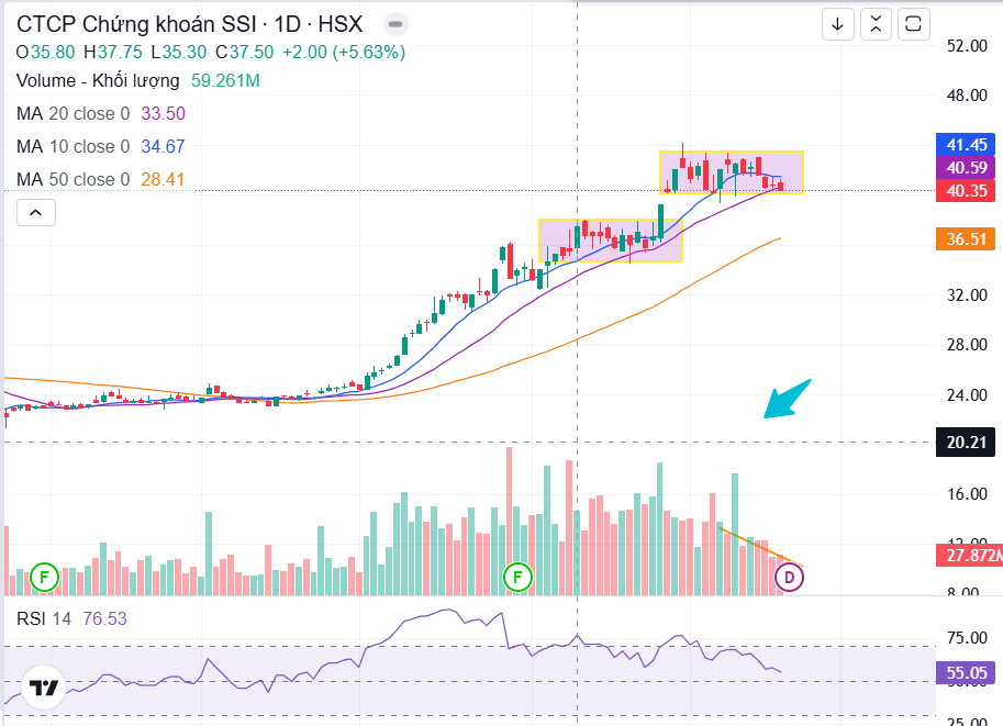 Trên thị trường, cổ phiếu SSI đã tăng 70% trong 3 tháng, đạt 40.000 đồng/cp – vùng giá cao nhất kể từ khi niêm yết năm 2006. SSI có mẫu hình nền chồng nền, ad đánh giá rằng đây là cổ phiếu khỏe nhất trong nhóm chứng khoán. HIện tại giá đang tích lũy đi ngang trong vùng 40 – 43 với thanh khoản cạn dần, phản ánh sự siết cung. Nếu có nhịp chỉnh về vùng 36-38 thì là điểm mua trung hạn đẹp cho cổ phiếu này với kỳ vọng tăng mạnh trong tương lai.