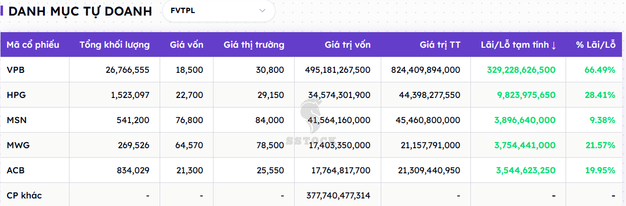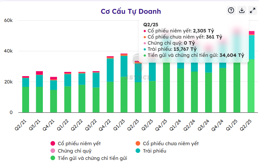 Danh mục tự doanh phòng thủ: Hơn 66% danh mục của SSI là tiền gửi và chứng chỉ tiền gửi – một chiến lược phòng thủ giúp tạo ra dòng thu nhập ổn định, đồng thời giảm rủi ro biến động từ thị trường cổ phiếu. Chỉ khoảng 5% là cổ phiếu thì trong đó phần lớn là nắm giữ VPB, điều này giúp mang lại lợi nhuận tốt cho SSI ( không quá lớn do chỉ nắm giữ phần nhỏ là 5% trong danh mục tự doanh)