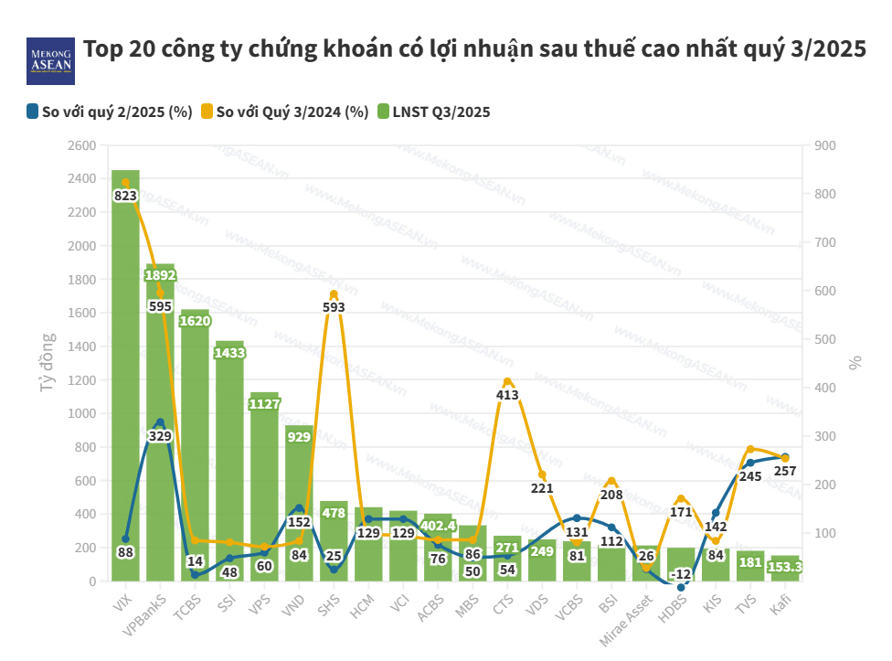 VIX dẫn đầu toàn ngành với lợi nhuận sau thuế đạt 2.450 tỷ đồng, tăng tới 824% so với cùng kỳ năm trước. Theo sau là VPBankS (1.892 tỷ đồng, tăng 596%), Techcombank Securities (1.620 tỷ đồng, tăng 85%), SSI (1.475 tỷ đồng, tăng 86%) và VPS (1.126 tỷ đồng, tăng 72%). Dù chưa chạm ngưỡng 1.000 tỷ, VNDirect vẫn ghi nhận mức tăng 84% so với cùng kỳ, đạt 929 tỷ đồng, đứng thứ 6 toàn ngành.