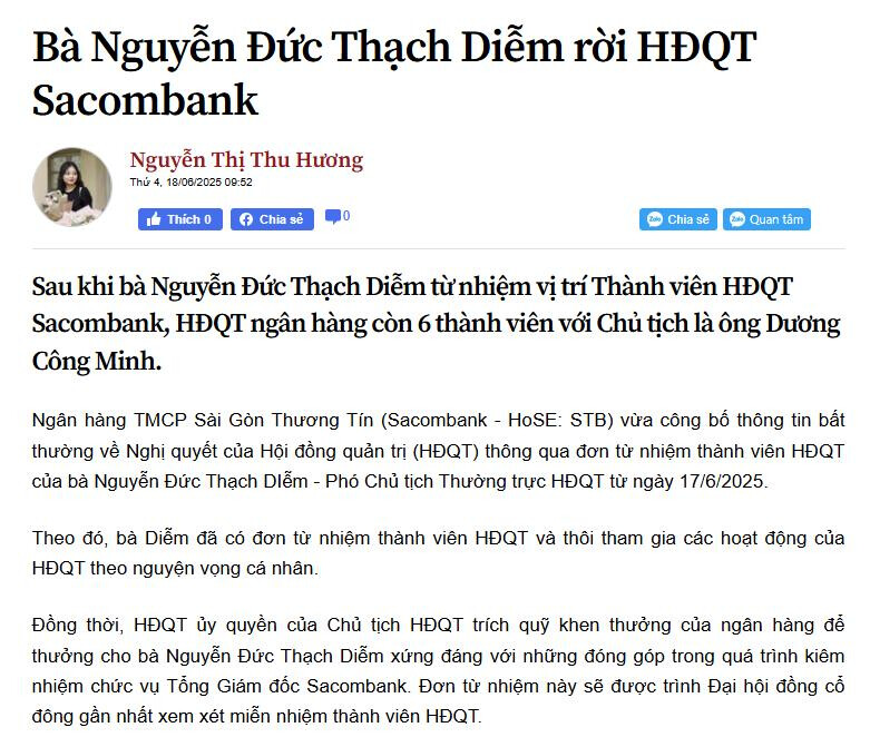 Theo đó, PYN Elite Fund đã bán hơn 1,1 triệu cổ phiếu STB vào ngày 26/2/2025, giảm tỉ lệ sở hữu tại Sacombank từ 6,02% xuống còn 5,96%, tương đương số cổ phiếu quỹ này sở hữu giảm từ gần 113,5 triệu cổ phiếu xuống còn gần 112,4 triệu cổ phiếu.