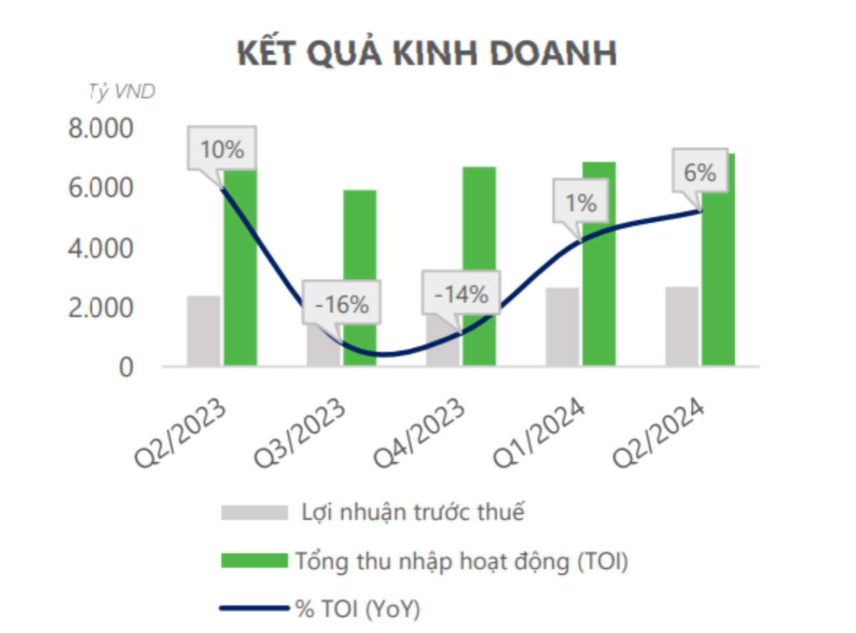 Trong quý 2/2024, Ngân hàng TMCP Sài Gòn Thương Tín (STB) ghi nhận tổng thu nhập hoạt động đạt 7.154 tỷ đồng, tăng 6% so với cùng kỳ năm trước (YoY) và tăng 4% so với quý trước (QoQ). Lợi nhuận trước thuế (LNTT) đạt 2.688 tỷ đồng, tăng 13% YoY và 1% QoQ. Thu nhập lãi thuần của STB đạt 6.117 tỷ đồng (+6% YoY, +3% QoQ) nhờ tăng trưởng tín dụng đạt 7% so với đầu năm. Tuy nhiên, biên lãi ròng (NIM) giảm nhẹ do ngân hàng triển khai gói vay ưu đãi 10 nghìn tỷ đồng với lãi suất thấp từ 3%/năm vào cuối tháng 3/2024. Thu nhập ngoài lãi đạt 1.038 tỷ đồng (+5% YoY, +12% QoQ), chủ yếu nhờ vào các hoạt động dịch vụ và thu hồi nợ xấu.