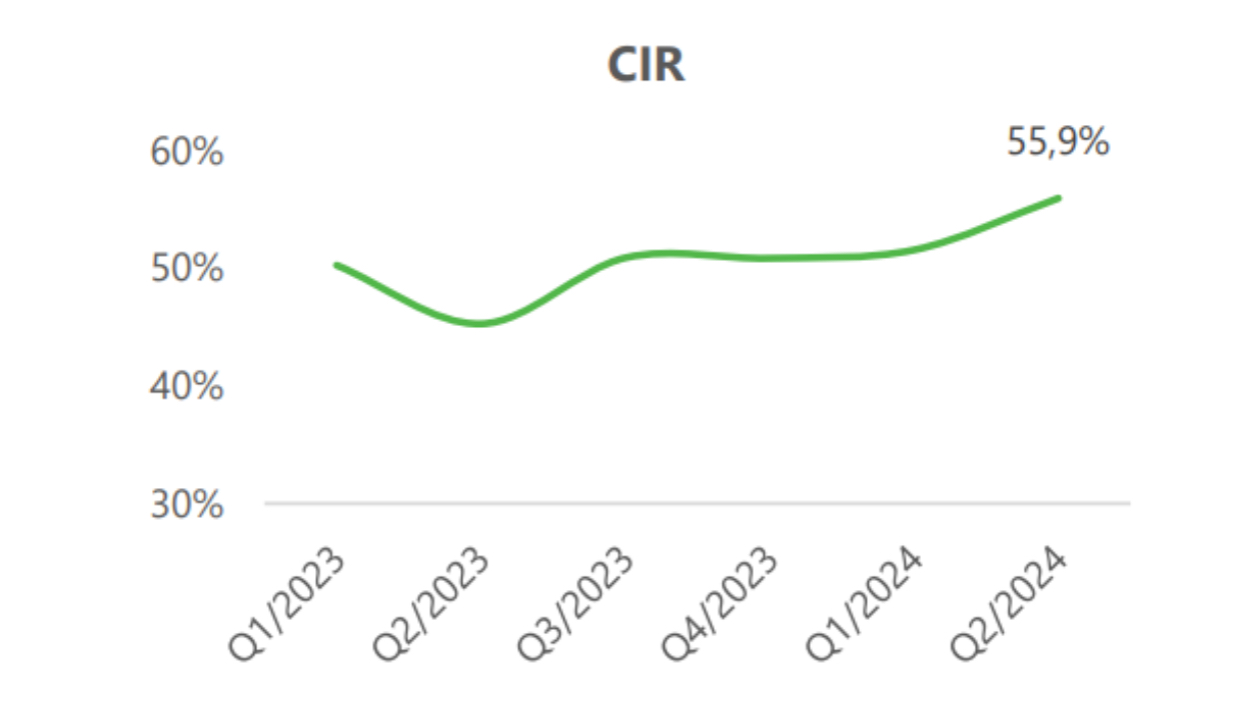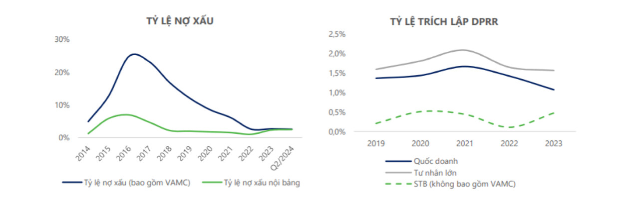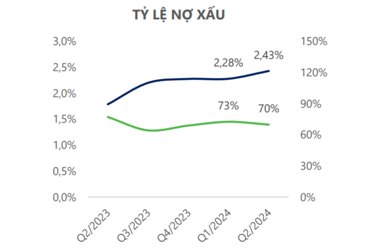 Chi phí hoạt động của STB trong quý 2/2024 tăng mạnh lên 4.001 tỷ đồng (+31% YoY, +13% QoQ), chủ yếu do chi phí lương và dự phòng tài sản trong quá trình tái cơ cấu. Điều này khiến tỷ lệ chi phí trên thu nhập (CIR) tăng lên 55.9%, cao hơn mức trung bình ngành. Tuy nhiên, chi phí trích lập giảm đáng kể xuống còn 465 tỷ đồng (-65% YoY, -31% QoQ) nhờ áp lực giảm từ trái phiếu VAMC. Tỷ lệ nợ xấu tăng nhẹ lên 2.43%, nhưng kỳ vọng sẽ ổn định trong nửa cuối năm 2024 nhờ sự phục hồi của nền kinh tế và lợi nhuận từ việc bán KCN Phong Phú, giúp STB xử lý nợ xấu tốt hơn.