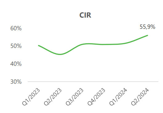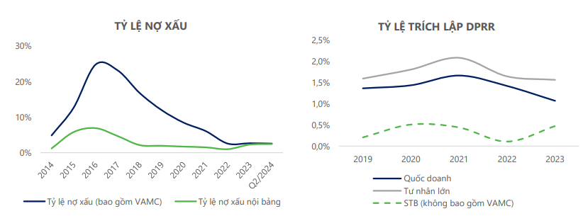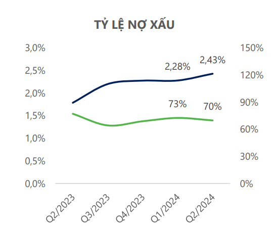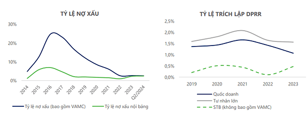 Chi phí hoạt động của STB trong quý 2/2024 tăng mạnh lên 4.001 tỷ đồng (+31% YoY, +13% QoQ), chủ yếu do chi phí lương và dự phòng tài sản trong quá trình tái cơ cấu. Điều này khiến tỷ lệ chi phí trên thu nhập (CIR) tăng lên 55.9%, cao hơn mức trung bình ngành. Tuy nhiên, chi phí trích lập giảm đáng kể xuống còn 465 tỷ đồng (-65% YoY, -31% QoQ) nhờ áp lực giảm từ trái phiếu VAMC. Tỷ lệ nợ xấu tăng nhẹ lên 2.43%, nhưng kỳ vọng sẽ ổn định trong nửa cuối năm 2024 nhờ sự phục hồi của nền kinh tế và lợi nhuận từ việc bán KCN Phong Phú, giúp STB xử lý nợ xấu tốt hơn.