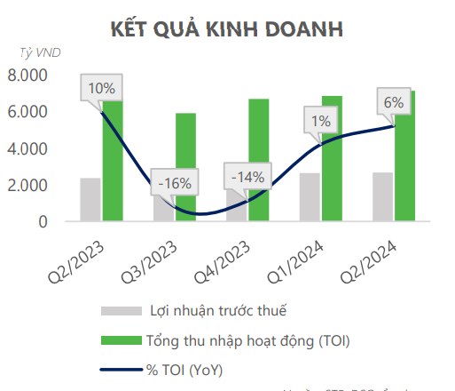 Trong quý 2/2024, Ngân hàng TMCP Sài Gòn Thương Tín (STB) ghi nhận tổng thu nhập hoạt động đạt 7.154 tỷ đồng, tăng 6% so với cùng kỳ năm trước (YoY) và tăng 4% so với quý trước (QoQ). Lợi nhuận trước thuế (LNTT) đạt 2.688 tỷ đồng, tăng 13% YoY và 1% QoQ. Thu nhập lãi thuần của STB đạt 6.117 tỷ đồng (+6% YoY, +3% QoQ) nhờ tăng trưởng tín dụng đạt 7% so với đầu năm. Tuy nhiên, biên lãi ròng (NIM) giảm nhẹ do ngân hàng triển khai gói vay ưu đãi 10 nghìn tỷ đồng với lãi suất thấp từ 3%/năm vào cuối tháng 3/2024. Thu nhập ngoài lãi đạt 1.038 tỷ đồng (+5% YoY, +12% QoQ), chủ yếu nhờ vào các hoạt động dịch vụ và thu hồi nợ xấu.