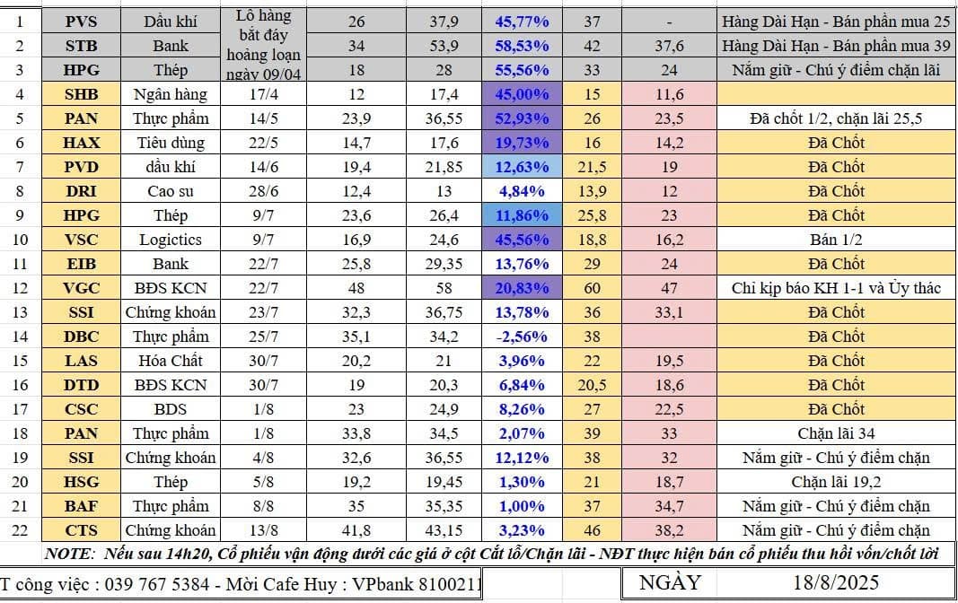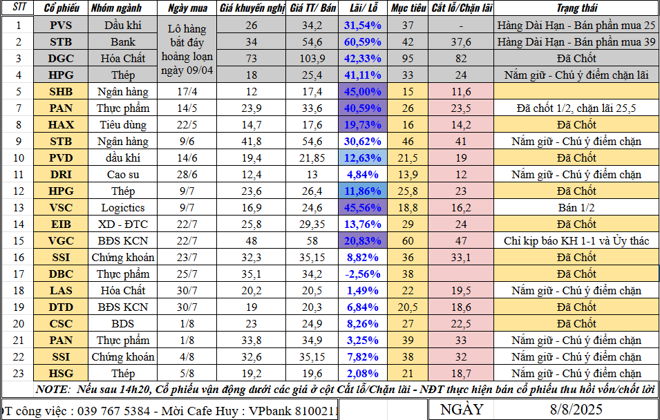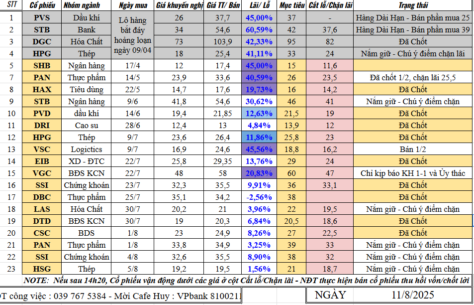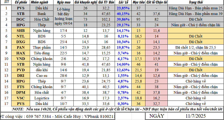 • Anh chị cập nhật Danh mục hiện tại theo BẢNG danh mục cổ phiếu Hệ thống đang nắm giữ, chú ý điểm CHỐT LỜI/CHẶN LÃI/CHẶN LỖ - Hành động mua bán Huy sẽ cập nhật trong Room chi tiết từng cổ phiếu