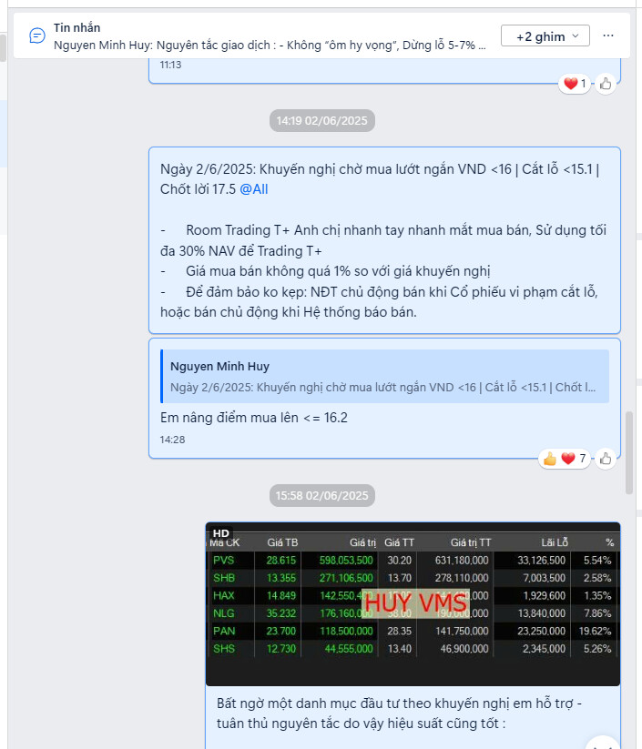 • Phiên nay, Anh chị tiếp tục nắm giữ cổ phiếu quan sát quá trình vận động của TT, vào phiên có dữ liệu TT, nếu cần có hành động mua bán cổ phiếu thì Huy sẽ cập nhật gửi đến cả nhà.