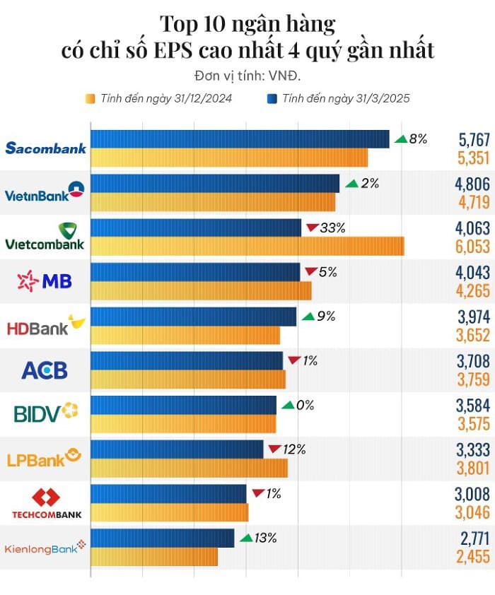 Nhiều năm không tăng VĐL nên quy mô số lượng cp của STB bây giờ khiêm tốn so với các ngân hàng tầm trung tương đương. Lợi nhuận những năm gần đây liên tục tăng trưởng cao, 2 chữ số và đạt mức hàng chục ngàn tỷ. Nên dễ hiểu vì sao EPS của STB cũng tăng nhanh các năm qua, và đến Q1.2025 này lần đầu tiên, vượt mặt hàng loạt “cây đa cây đề” trên thị trường bank, để chiếm luôn vị trí số 1.