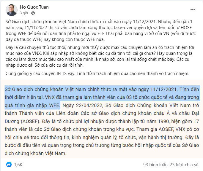 Theo quy định của Sở giao dịch Chứng khoán Thái Lan (SET), các công ty chỉ được phép rót vốn vào sản phẩm ETF tại các quốc gia có sở giao dịch chứng khoán là thành viên của WFE. Do đó, việc HOSE và HNX không còn là thành viên của WFE đã làm dấy lên lo ngại về dòng vốn đầu tư từ Thái Lan. Hồ Quốc Tuấn