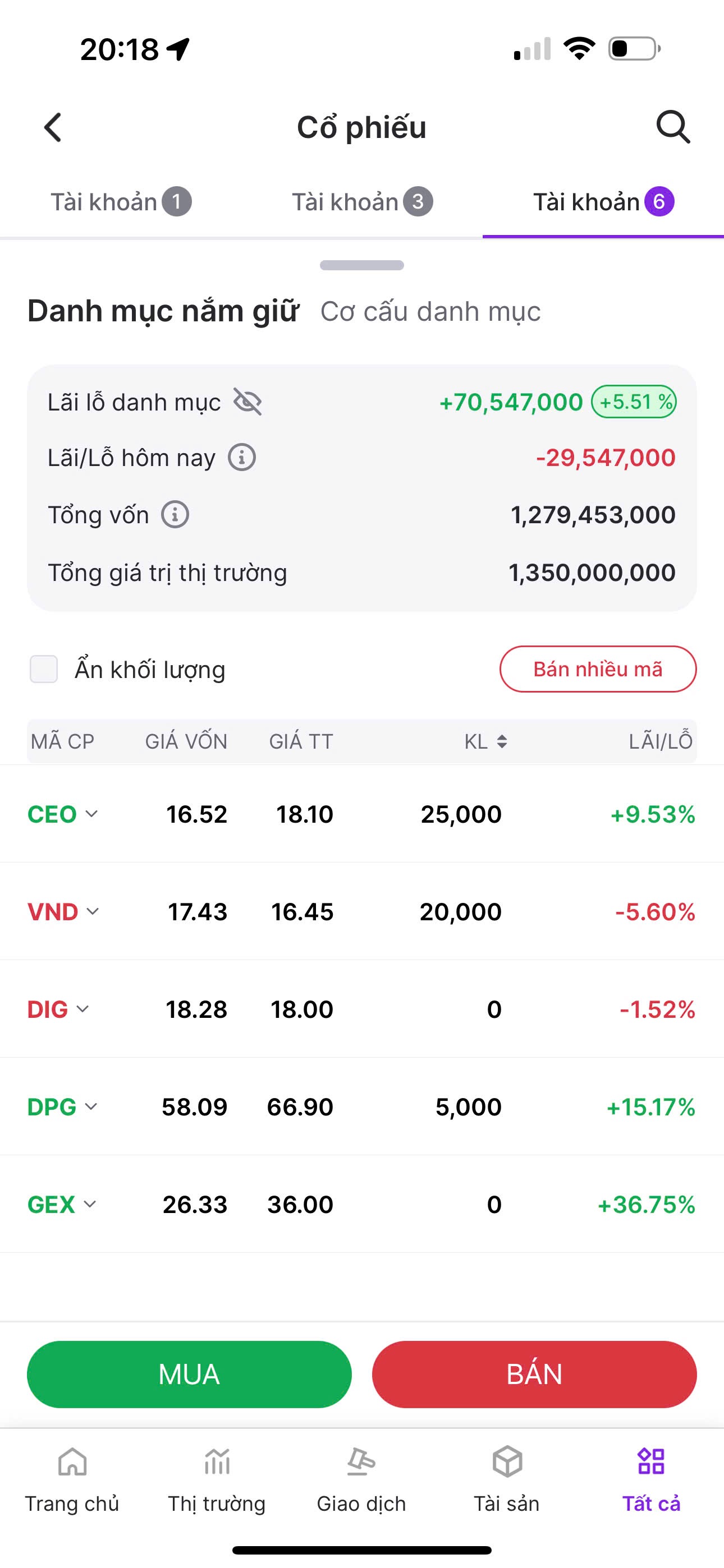Thị trường giảm 20 điểm nhưng danh mục bị lỗ mất 4 củ cũng ổn rồi. Có điều em VND báo quá báo, anh em nên tập trung CEO, DIG giai đoạn tới. Tôi sẽ cập nhật tài khoản hàng ngày để hành trình này VNI lên 148x xem tk tôi lãi bao nhiêu %