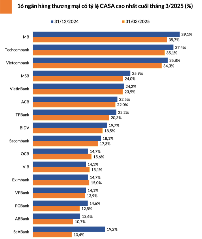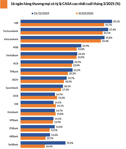 Tỷ lệ CASA các ngân hàng tính đến 03/2025 (Nguồn: CafeF)