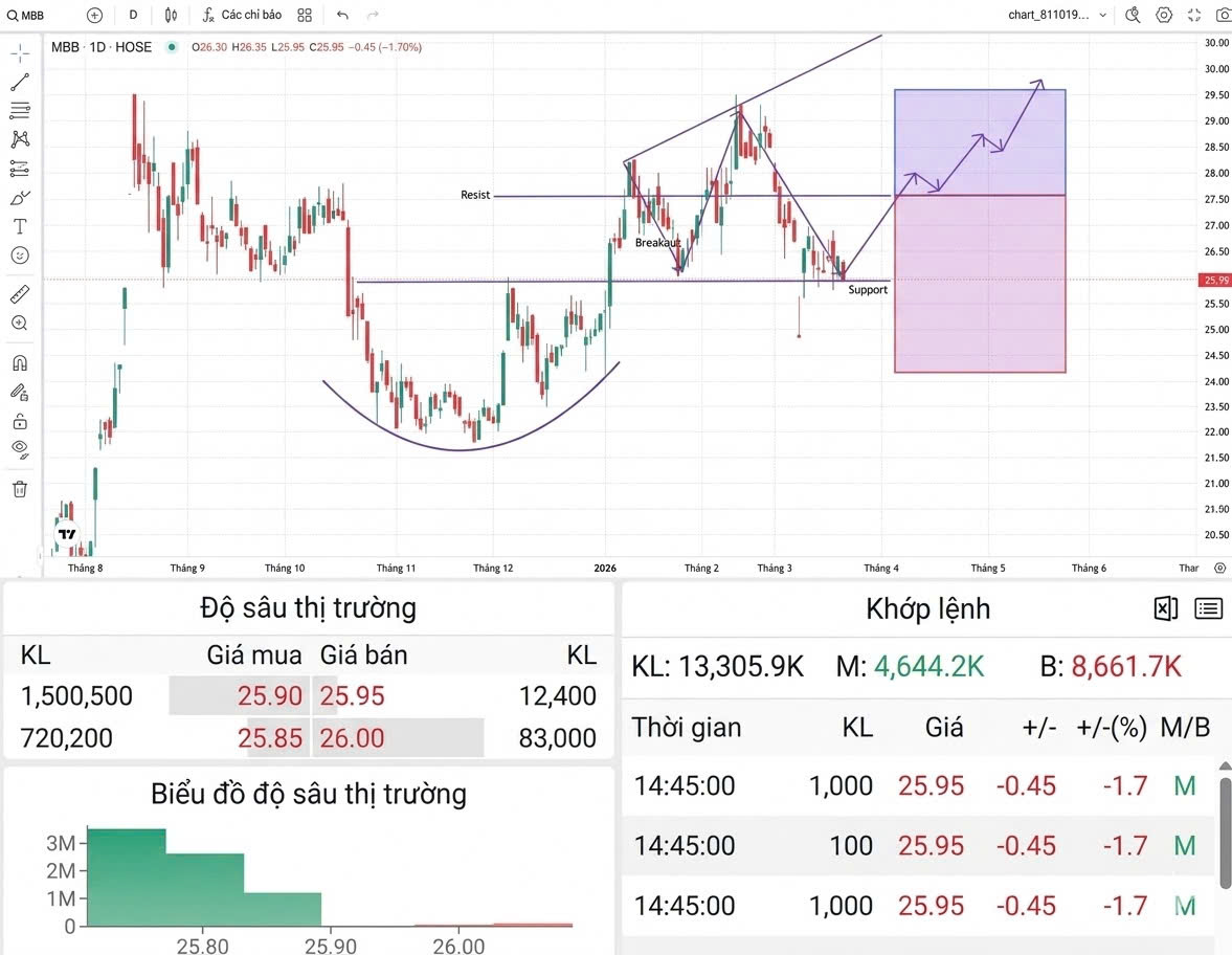 Về kỹ thuật: MBB đang di chuyển với đáy sau cao hơn đáy trước, hình thành mô hình Ascending Triangle điển hình. Việc giữ vững trên ngưỡng hỗ trợ 26.15 bất chấp rung lắc cho thấy áp lực bán đã cạn và lực cầu tổ chức vẫn bền bỉ.