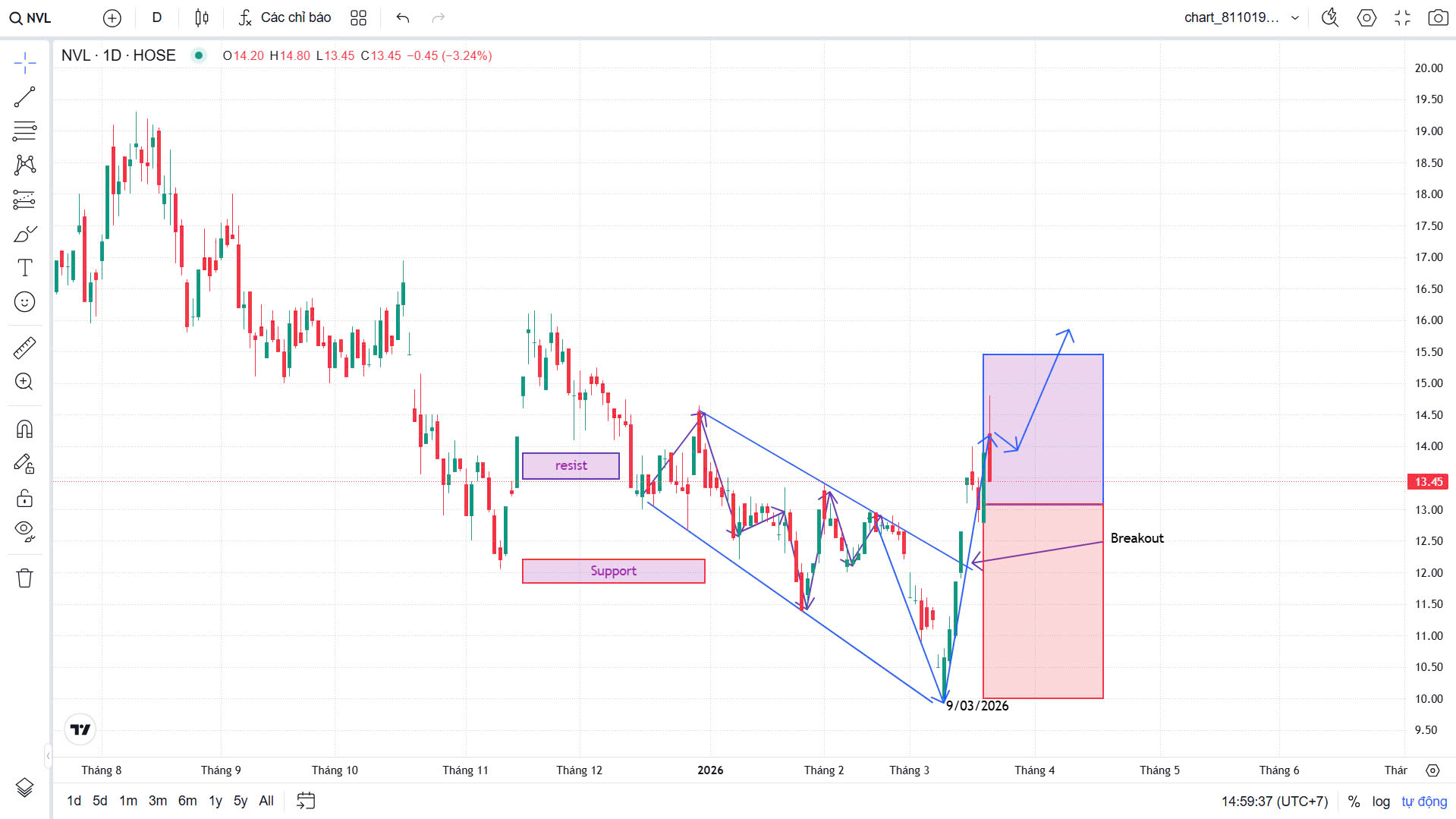 Về kỹ thuật: Sau khi thiết lập đáy ngắn hạn quanh vùng giá 10.0, NVL đã chính thức phá vỡ (Breakout) kênh xu hướng giảm kéo dài. Đây là tín hiệu quan trọng xác nhận sự thay đổi trạng thái từ giảm giá sang tích lũy và hồi phục.