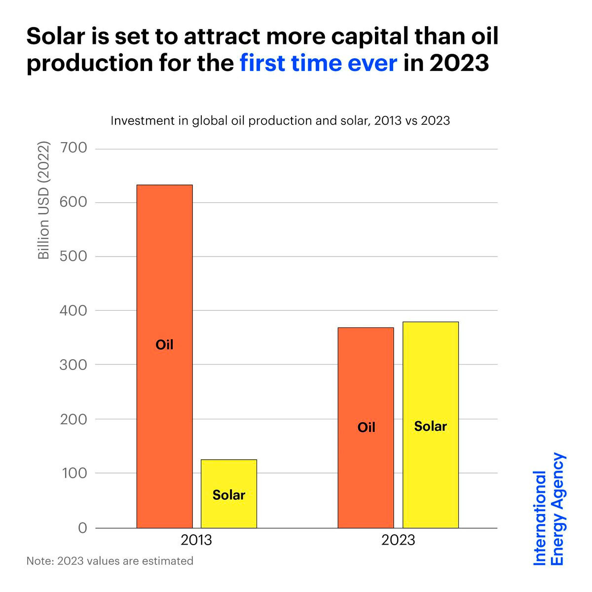 Và lần đầu tiên, năng lượng mặt trời được thiết lập để thu hút nhiều vốn hơn sản xuất dầu trong năm nay.