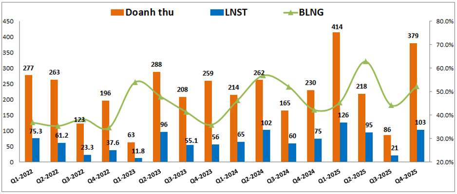 Kết thúc Q4-2025 SZC ghi nhận doanh thu thuần đạt 379 tỷ đồng, tăng 64.8% yoy. Lợi nhuận sau thuế ghi nhận 103 tỷ đồng, tăng 37.3% yoy. (Hình 1)