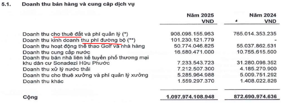 Lũy kế cả năm 2025 doanh thu đạt 1,098 tỷ đồng, tăng 25.8% yoy. Lợi nhuận sau thuế đạt 345 tỷ đồng, tăng 14.2% yoy. Đóng góp chính vào KQKD của công ty trong năm 2025 vẫn là mảng cho thuê đất KCN với tỉ trọng đóng góp lên tới 82.7% về doanh thu và 99.3% lợi nhuận gộp. Ngoài ra mảng thu phí BOT cũng bắt đầu đóng góp vào KQKD trở lại trong 2025, tuy nhiên mảng golf vẫn tiếp tục ghi nhận mức lợi nhuận âm. Mảng còn lại là BĐS trong 2025 gần như không có đóng góp gì cho kqkd của công ty khi dự án duy nhất đang kinh doanh lại khá ảm đạm trong khâu bán hàng. (Hình 2)