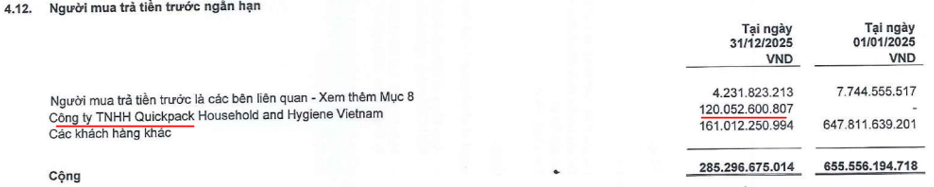 Trong năm 2025 cũng xuất hiện thêm khách hàng mới trong mục người mua trả trước là Quickpack household and Hygiene Vietnam với 120 tỷ đồng. (Hình 4)