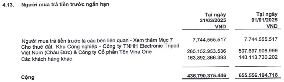 Kết quả kinh doanh ấn tượng đạt được trong Q1 là nhờ công ty đã bàn giao quỹ đất cho các khách hàng lớn là Tripod và Vinaone. Các khách hàng này chúng tôi đã phân tích tại bài viết gần nhất. Đáng chú ý là lượng đất bàn giao cho 2 công ty trên vẫn chưa hết và hiện vẫn còn một phần trên khoản mục người mua trả trước với khoảng 265 tỷ đồng. (Hình 2)