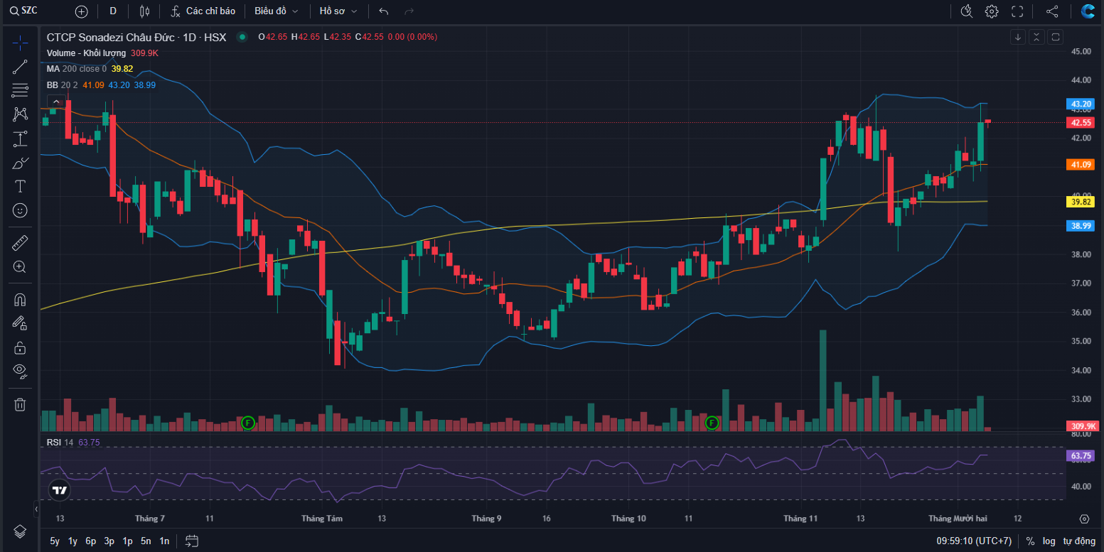 Hiện tại (phiên ngày 14/11) SZC đang có chart kỹ thuật neo ở vùng cao khá đẹp sau giai đoạn tăng giá với thanh khoản lớn trước đó. Những phiên giảm điểm cũng chỉ đi kèm với thanh khoản thấp nên chưa có dấu hiệu rủi ro -vẫn kỳ vọng đây sẽ là vùng nền tiếp theo cho SZC. Vùng khuyến nghị mua thêm: 41 -41.3
