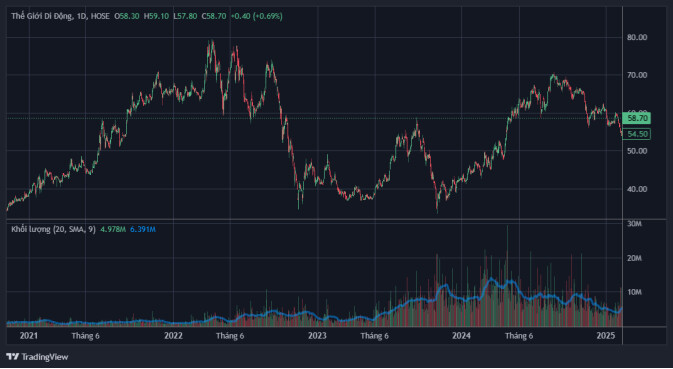 Khối lượng giao dịch và xu hướng giá cổ phiếu MWG từ năm 2021 đến năm 2024