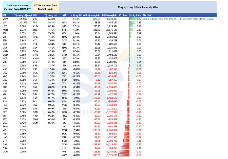 FPT dự kiến được thêm mới trong STOXX Vietnam Total Market Liquid. Do đó, quỹ FTSE Vietnam ETF sẽ mua nhiều nhất 8,6 triệu cổ phiếu nâng tỷ lệ lên 0,70%