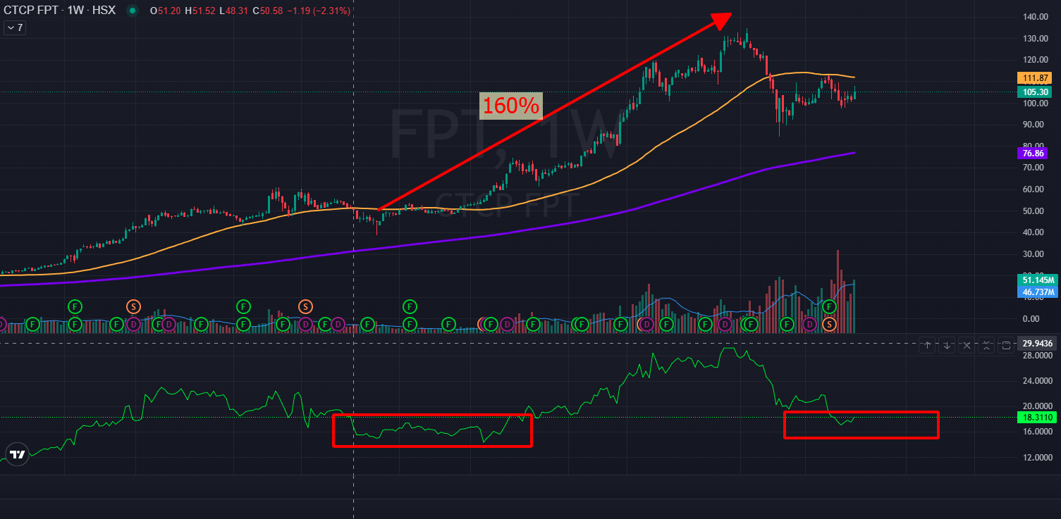 Trước đó, tại vùng đáy 2023 FPT đã có nhịp tăng giá ấn tượng khi tăng đến 160%, gần như được xem là cổ phiếu đánh bại mọi chu kỳ kinh tế. Giờ đây một lần nữa định giá P/E của FPT đã quay về mức định giá này. Mở ra một cơ hội mua gom cổ phiếu tốt.