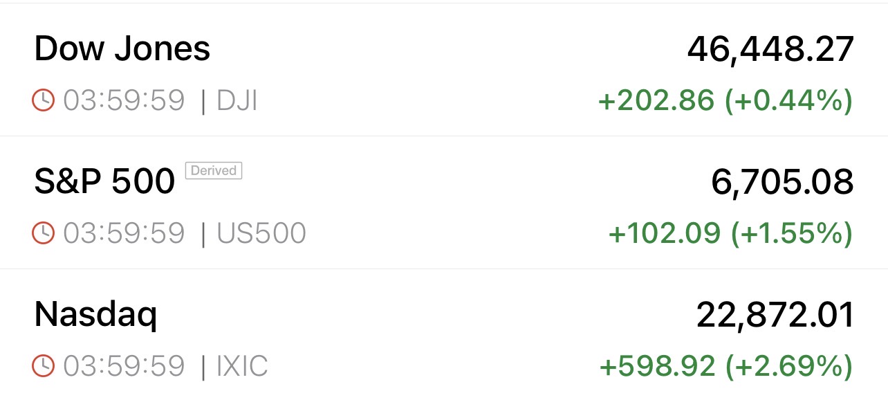 Phố Wall đêm qua lại tiếp tục tăng khủng nhờ triển vọng FED hạ ls trong tháng sau và đà tăng của cp CN.