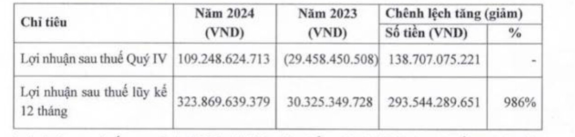lợi nhuận sau thuế quý 4 đạt gần 218 tỷ đồng trong khi cùng kỳ lỗ 287 triệu đồng.