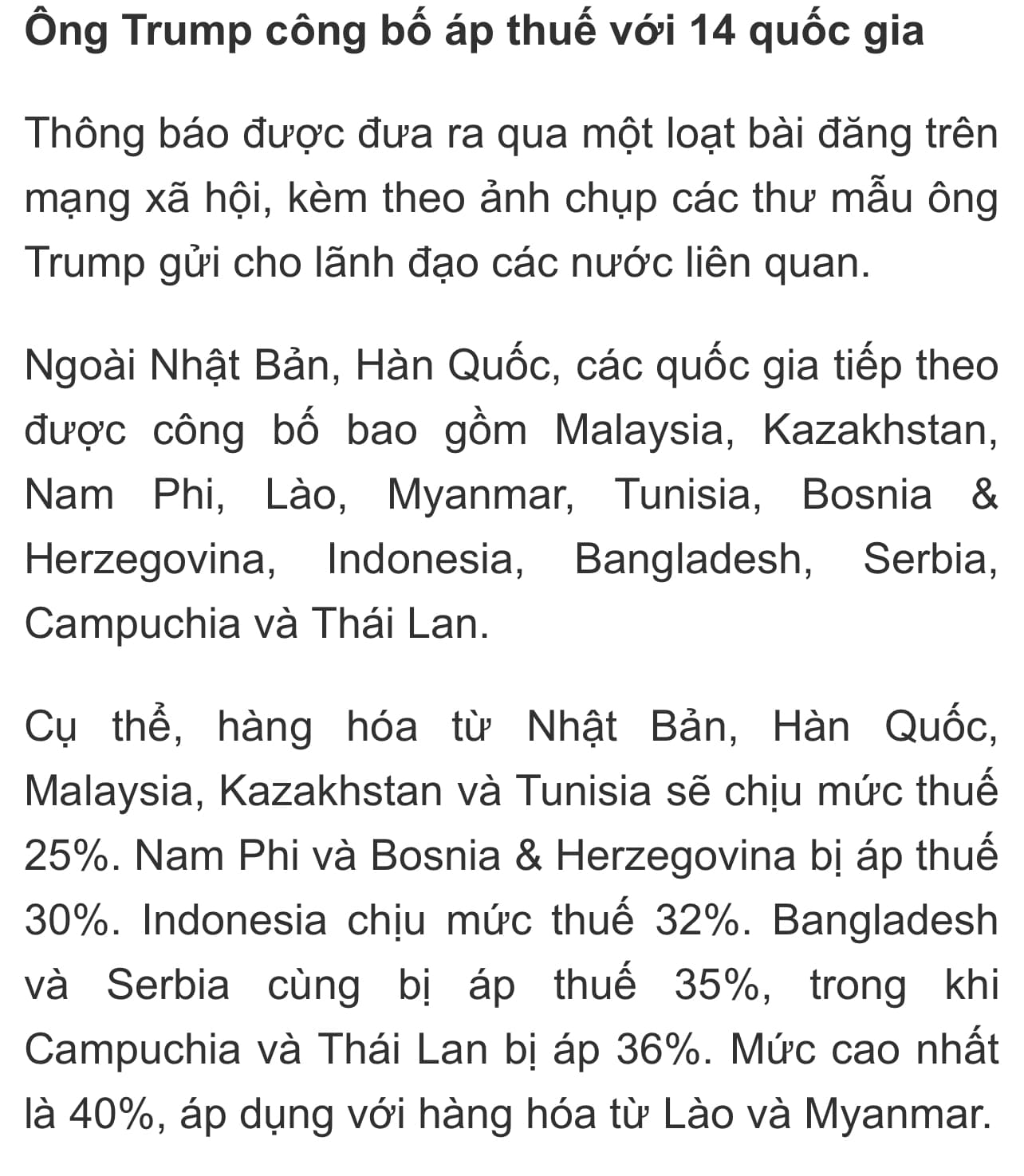Với thuế áp cho Thái, Indo, Malaysia, Lào, Cam như vậy mới thấy đc Vn quá tài tình. Bác Tô lái tàu cực hay nhỉ? Ngay khi Mẽo muốn áp 46, thì lập tức điện gọi và dàn xếp rất khéo vì mục tiêu của VN có lẽ là duy trì vị thế cạnh tranh với các nước khác.