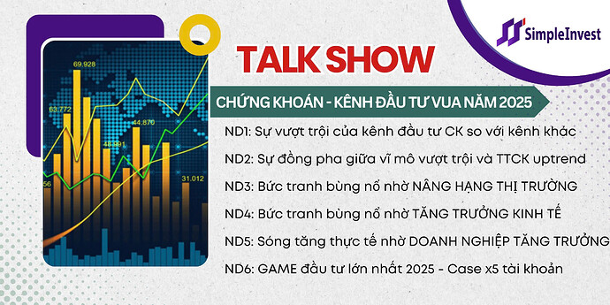 => Buổi talkshow này không chỉ là nơi để bạn cập nhật kiến thức, mà còn là cơ hội để giao lưu, học hỏi kinh nghiệm từ đội ngũ chuyên gia SimpleInvest và nhà đầu tư thành công. Hãy cùng SimpleInvest khám phá những cơ hội đầu tư tiềm năng và xây dựng chiến lược đầu tư hiệu quả cho năm 2025 nhé!