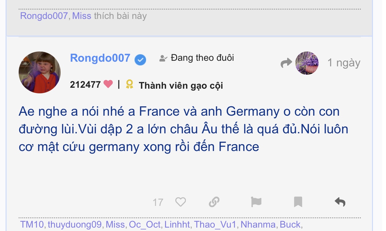 Yếu hơn, a đã nói Germany and france được kíu tin chưa?? E nào lưu tin post lên cho a e